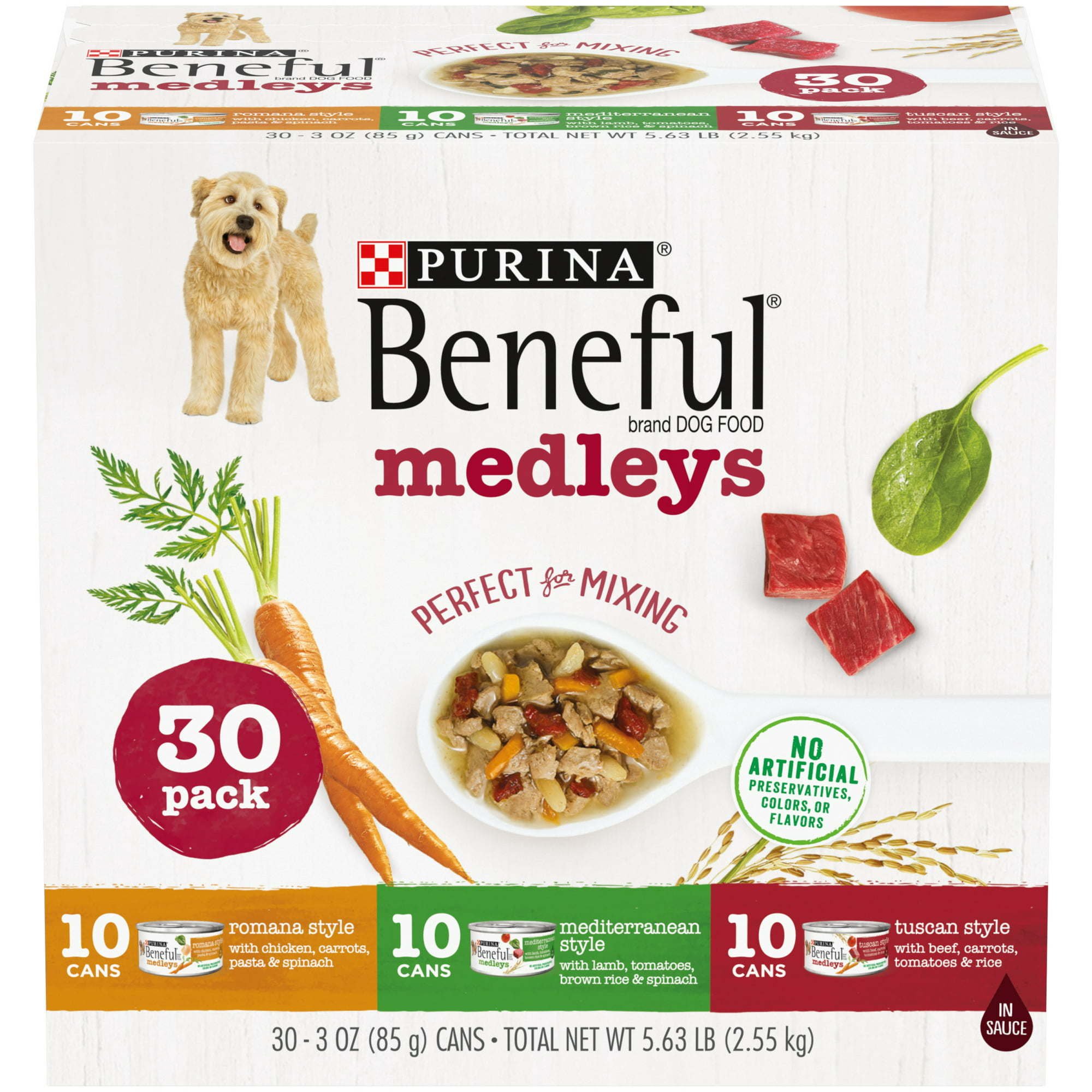 Purina Beneful Medleys Wet Dog Food Variety Pack Chicken Lamb Beef, Dial up the excitement at mealtime with the culinary recipes inspired from around the world in the Purina Beneful Medleys adult wet dog food variety pack. This canned dog food variety pack features some of your pal's favorite flavors, including Tuscan, Romana and Mediterranean Style. Tender chunks made with real beef, chicken or lamb come together with high-quality ingredients you can see, like real carrots, tomatoes and spinach, and whole grains like pasta. We then drench the premium dog food with generous portions of savory sauce he can't wait to dive into.